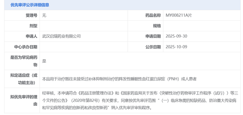 2025年10月15日,武汉朗来科技发展有限公司(以下简称“朗来科技”)自主研发的化学药品1类创新药MY008211A片,结束拟优先审评品种公示期,被国家药品监督管理局药品审评中心(CDE)正式纳入优先审评品种名单,用于治疗既往未接受过补体抑制剂治疗的阵发性睡眠性血红蛋白尿症(PNH)成人患者。同时,此品种的新药上市许可申请(NDA)已于2025年10月17日被CDE成功受理,进入注册审评阶段。
